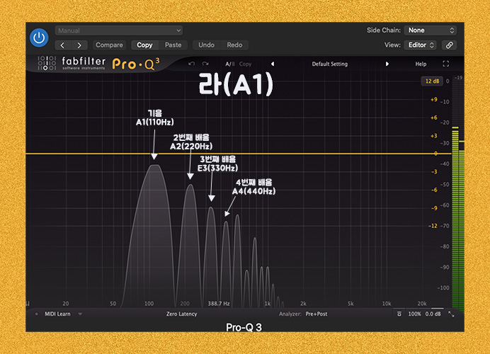 위에 주파수 110Hz를 가진 A1 음의 2번째 배음은 220Hz이면서 한 옥타브 위인 A2가 된다고 했고, 4번째 배음인 440Hz는 A4가 된다고 했다.