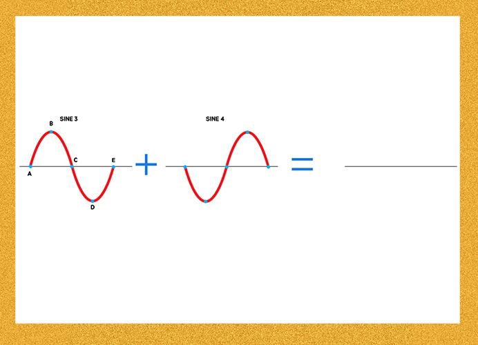 하지만 반대로, 위의 그림과 같이 sine 3이라는 파형 위에, 180도로 뒤집어놓은 Sine 4라는 파형을 얹어놓으면 (Sine 4의 시작점을 Sine 3의 시작점인 A 지점의 위치에 겹치도록 놓는다면) 역상 관계가 되면서 서로 상쇄가 되어 소리가 들리지 않게 되는데,