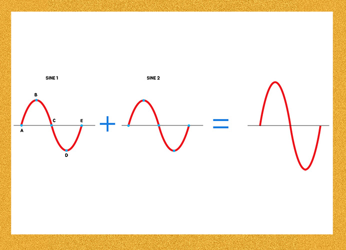 위의 그림과 같이 Sine 1이라는 sine 파가 하나 있다고 하자. 그림 맨 위의 Sine 1이라는 파형에는 A ~ E 지점이 각각 있다.