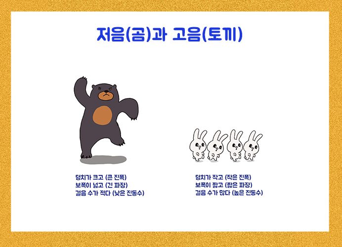 곰은(저음) 덩치가 크고(진폭) 보폭은 넓은데(파장) 걸음 수가 적다. (진동수)