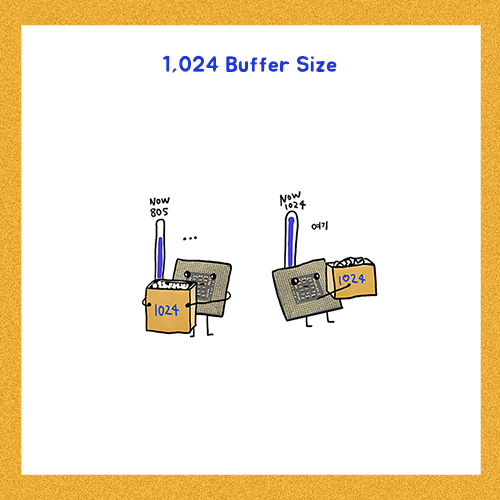 이렇게, 1024처럼 큰 숫자의 버퍼사이즈를 설정하면, 데이터가 1,024개가 모일 때까지 기다렸다가 넘겨주는 것이기 때문에 Latency(딜레이)가 발생하게 된다.