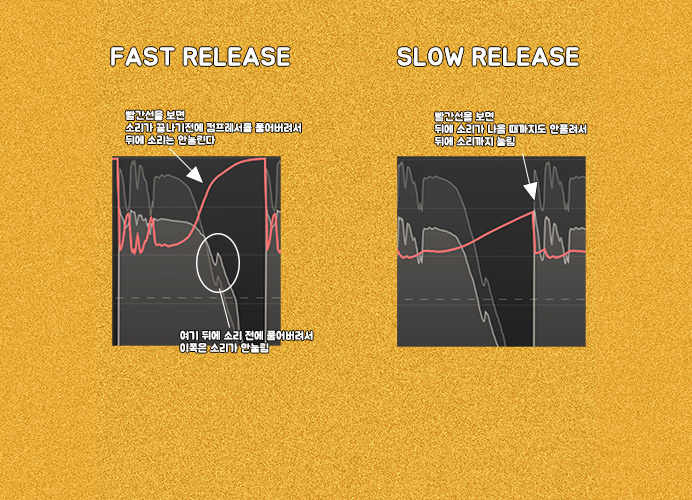 누른 후에, 언제 다시 뗄 것인가를 정하는 것이다. "까악" 이라는 소리에서 Release를 빠르게 하면 "까"만 눌러지고 "악"이 나오기 전에 떼는 것이기 때문에 "악"은 눌러지지 않게 된다. 반면에, Release를 길게 하면 "악"까지 누른 후에 한참 지나서 떼어진다.