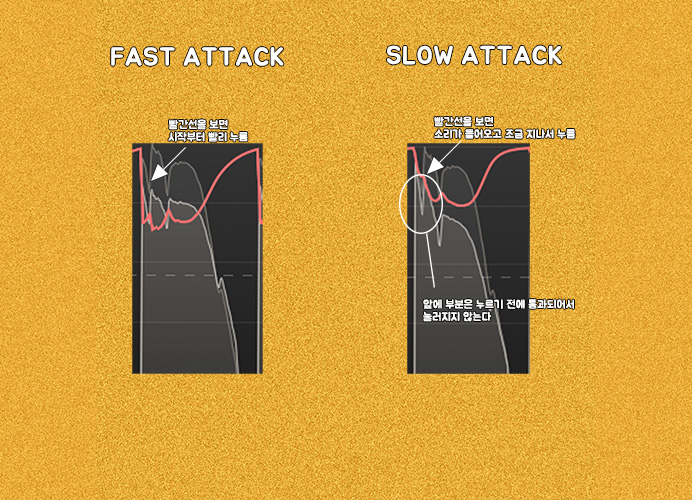 소리가 감지되면서 얼마나 빠르게 누를 것인지다. 예를 들어, "까악" 과 같은 소리가 있는데, Attack이 빠르면 까악이 들어오자마자 눌러지게 되는 것이므로, 소리가 "까"부터 눌러지게 된다. 그러나 Attack을 조금 느리게 주면, "까"는 안 눌러서 그대로 나오게 되고 "악"만 눌러지게 된다.