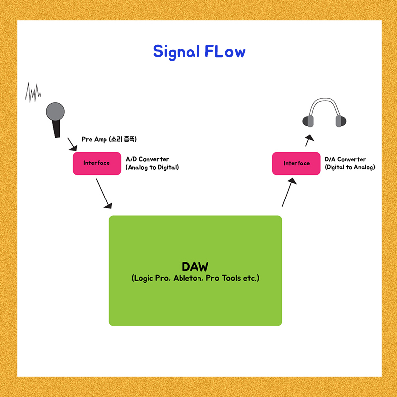 3. 증폭된 신호가 A/D Converter 를 통해서 디지털로 변환이 되어서 우리의 DAW로 들어오게 된다.